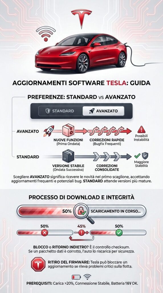 Vi sarete sicuramente accorti di quanto spesso si discuta, all’interno della nostra community, della reale differenza tra l’impostazione Standard e quella Avanzata per la ricezione dei software nelle nostre Tesla. Molti di Voi si saranno chiesti se questa scelta influisca davvero sulla velocità con cui riceviamo le novità o se sia solo una preferenza estetica. La realtà tecnica è che selezionando l’opzione Avanzato non accedete a versioni sperimentali instabili, ma semplicemente chiedete al sistema di essere inseriti nel primo scaglione di distribuzione pubblica. Questo implica che avrete la possibilità di testare le nuove funzioni prima degli altri, ma dovrete anche mettere in conto la ricezione di piccoli e frequenti aggiornamenti correttivi che servono a rifinire il software prima che questo venga distribuito, in una forma più consolidata, a chi ha scelto il profilo Standard.