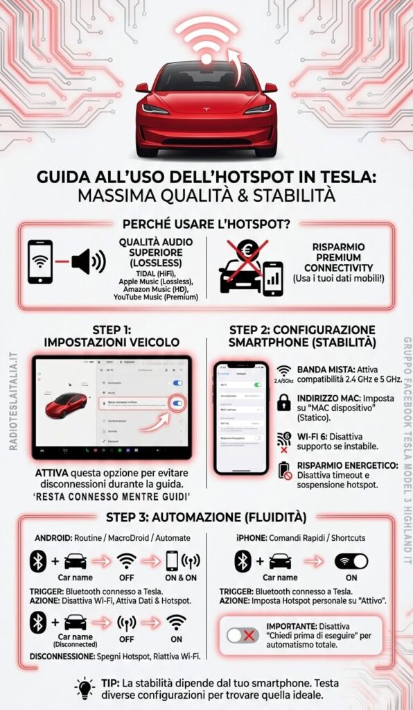 Molti di Voi avranno sicuramente valutato se il canone mensile per la Premium Connectivity sia davvero una spesa indispensabile per le proprie necessità. Al di là dell’indubbio vantaggio per chi desidera ascoltare musica in alta qualità lossless tramite Tidal o Apple Music, la scelta di utilizzare il proprio hotspot personale nasce spesso da una riflessione molto pragmatica. Se non utilizzate con frequenza le funzioni esclusive del pacchetto Tesla, come la visualizzazione remota delle telecamere di sicurezza dall’applicazione, ha poco senso sostenere un costo fisso di dieci euro al mese quando i Vostri piani tariffari mobili dispongono già di centinaia di gigabyte di dati che spesso restano inutilizzati. Tuttavia, per rendere questa soluzione fluida e affidabile, è necessario intervenire con precisione sulla configurazione dello smartphone e sulla sua automazione.
